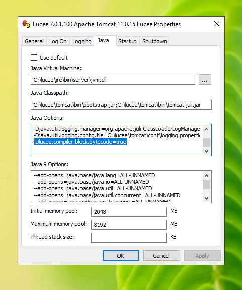 Additional, marginally related question. I’ve installed Lucee with the Windows installer with IIS acting as a reverse proxy using the BonCode connector. I’d eventually like to load compiled .cf* files with accompanying source. I’ve done this before in Lucee 6. I noticed Lucee 7 has the following setting by default. How do I get the following setting change (i.e. LUCEE_COMPILER_BLOCK_BYTECODE=false) applied to Lucee which is loaded by a Windows Service.