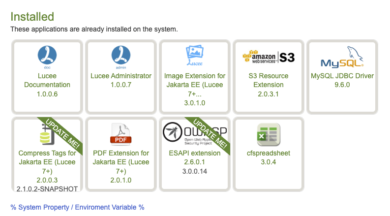 I click on any extension (mysql or esapi or Lucee Documentation);
