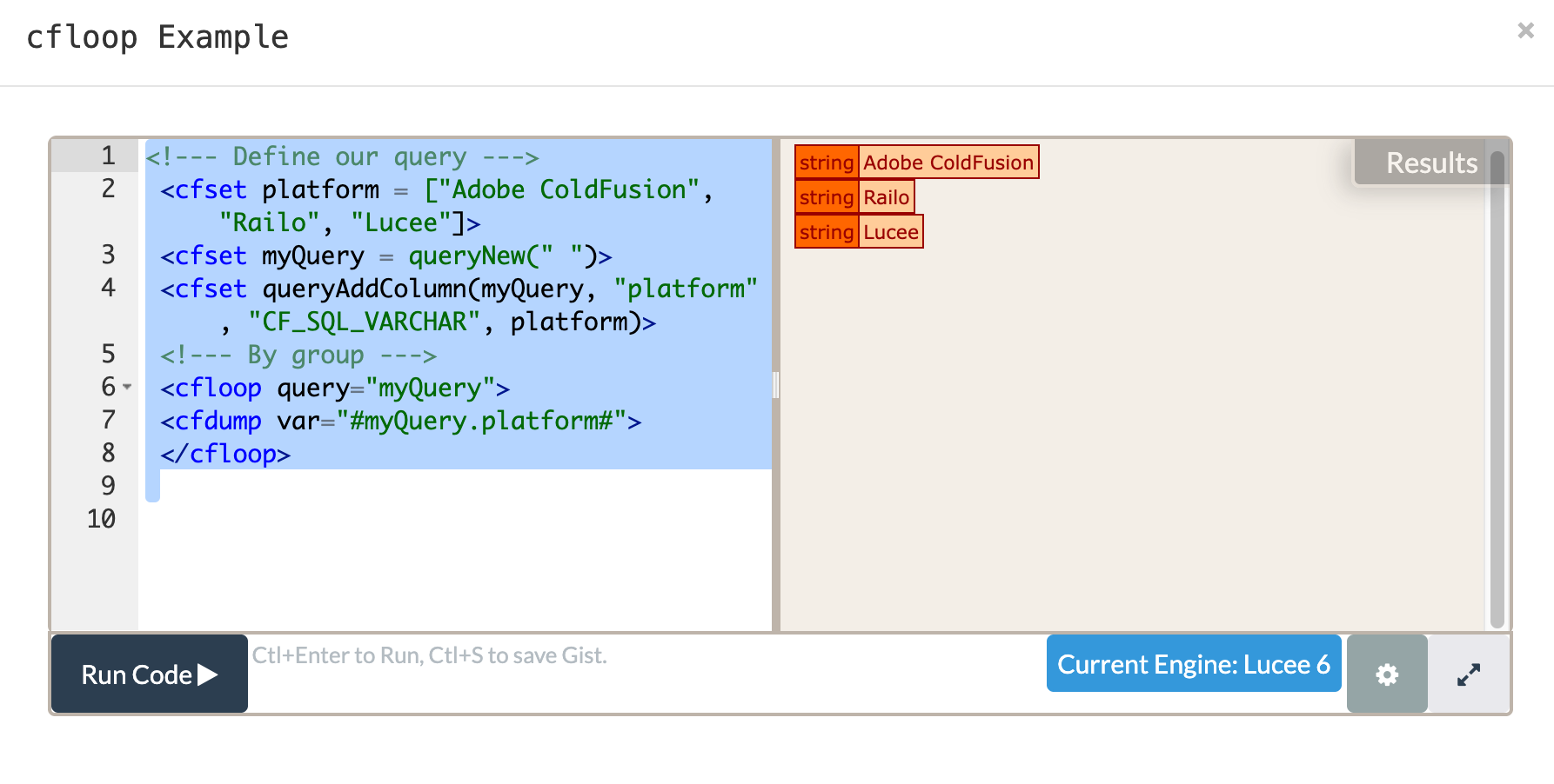 <cfset platform = ["Adobe ColdFusion", "Railo", "Lucee"]>