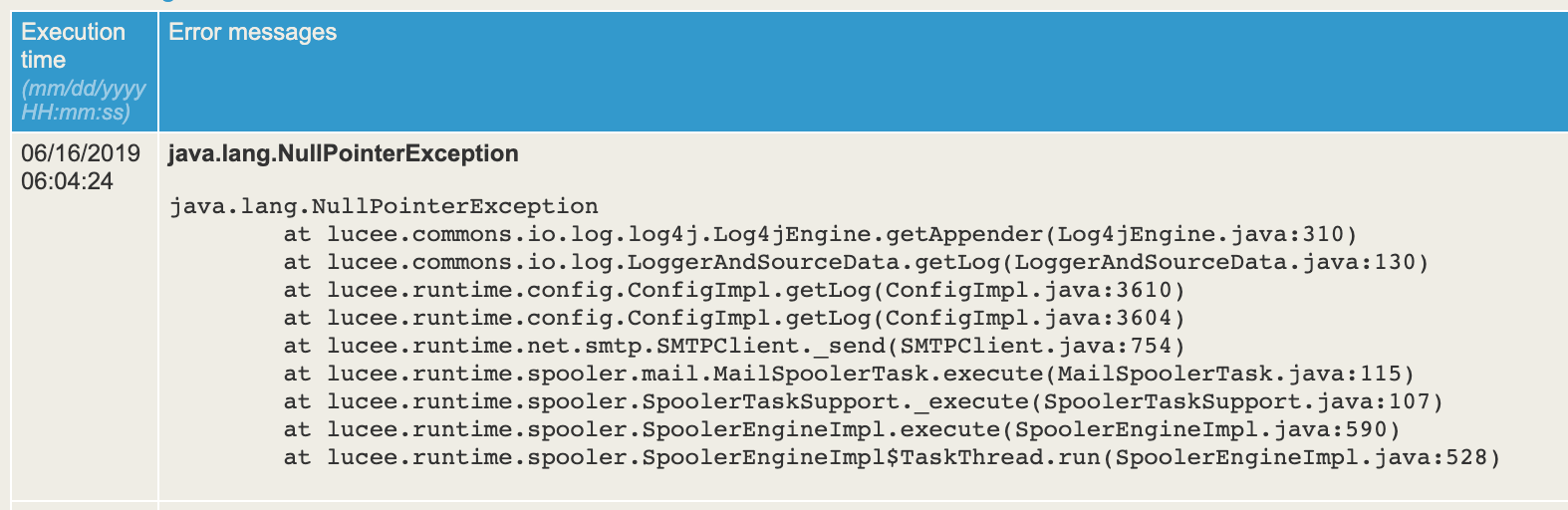 In a related issue, I have not been able to get cfmail tags working. When I go to tasks, I get a similar message. Is it possible that the mail is not working because it hangs on the logging?